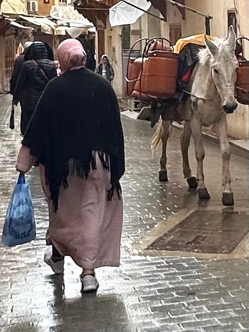 You always had your favorite vendor on our walk from the Dar into the wider souks, or whatever path we’d chosen for the day. You know how narrow the alley can be, and then - suddenly - it opens wide. The place you liked has just enough space for a broad swath of people to pass each other: locals, travelers, motorbikes weaving through, handcarts stacked with baskets (of baskets!) heading toward restaurants, donkey carts hauling cement bricks for the endless construction.